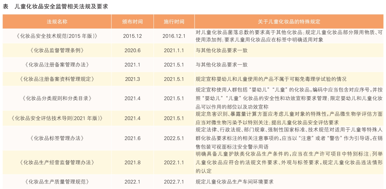 《化妝品監(jiān)督管理條例》自2021年1月1日起施行后,配套法規(guī)文件密集發(fā)布,兒童化妝品安全監(jiān)管法規(guī)體系加快完善。