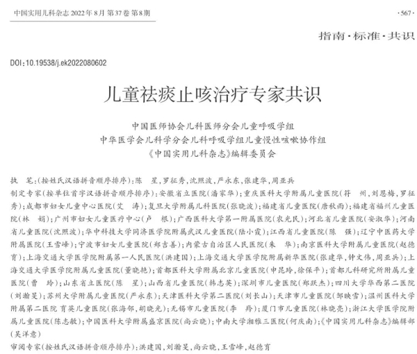 近日,由中國(guó)醫(yī)師協(xié)會(huì)兒科醫(yī)師分會(huì)兒童呼吸專(zhuān)家組、中華醫(yī)學(xué)會(huì)兒科學(xué)分會(huì)兒科呼吸學(xué)組兒童慢性咳嗽協(xié)作組、《中國(guó)實(shí)用兒科雜志》編輯委員會(huì)發(fā)起,組織全國(guó)40位專(zhuān)家制定了《兒童祛痰止咳治療專(zhuān)家共識(shí)》,該共識(shí)發(fā)布于中國(guó)實(shí)用兒科雜志2022年8月第37卷第8期。