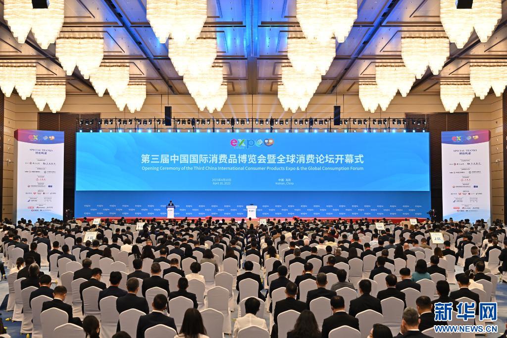 第三屆中國國際消費(fèi)品博覽會(huì)開幕,這是4月10日拍攝的開幕式現(xiàn)場。當(dāng)日,第三屆中國國際消費(fèi)品博覽會(huì)在海南海口開幕。本屆消博會(huì)以“共享開放機(jī)遇、共創(chuàng)美好生活”為主題,將助力消費(fèi)恢復(fù)和升級,為各國企業(yè)共享中國市場提供機(jī)遇。新華社記者 李鑫 攝