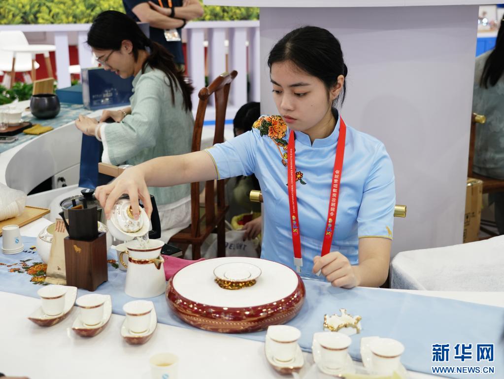 4月10日,消博會(huì)福建展臺(tái)的工作人員在為參觀者沏茶。當(dāng)日,第三屆中國國際消費(fèi)品博覽會(huì)在海南??陂_幕。本屆消博會(huì)以“共享開放機(jī)遇、共創(chuàng)美好生活”為主題,將助力消費(fèi)恢復(fù)和升級,為各國企業(yè)共享中國市場提供機(jī)遇。新華社記者 樊雨晴 攝