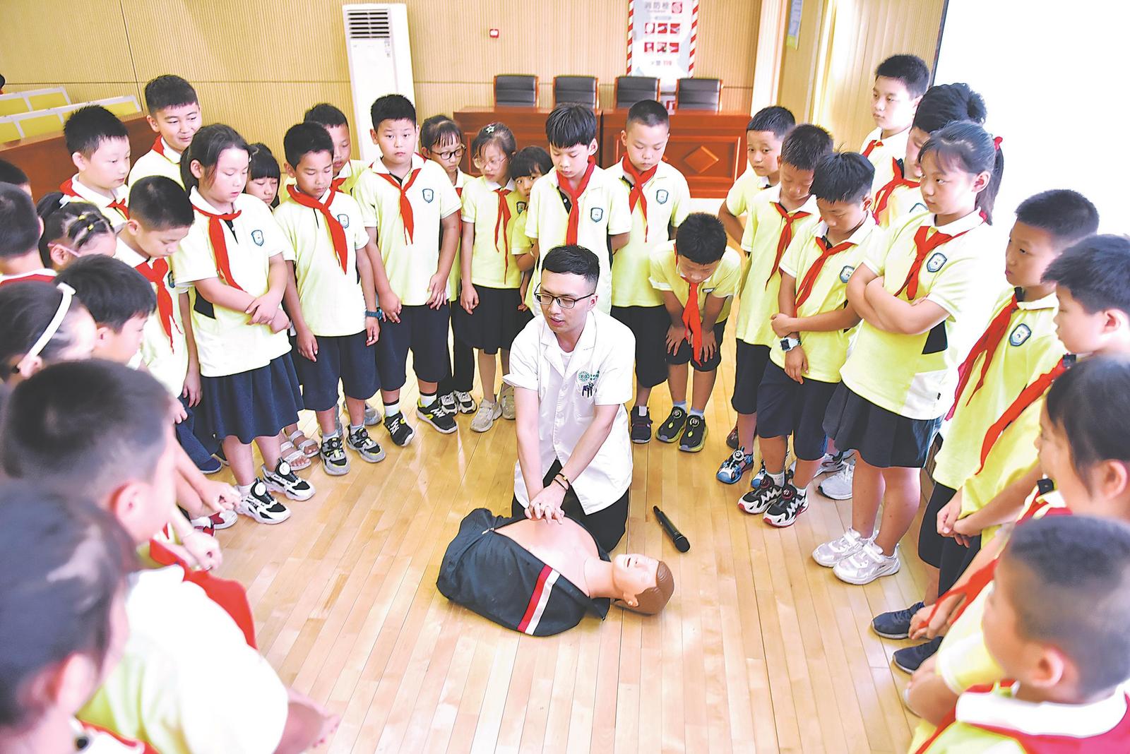 9月9日是2023年“世界急救日”。9月6日,合肥市振興小學(xué)開(kāi)展“應(yīng)急救護(hù)進(jìn)校園”活動(dòng),邀請(qǐng)合肥市蜀山區(qū)健康巡講專家現(xiàn)場(chǎng)向師生傳授應(yīng)急救護(hù)技能和自動(dòng)體外除顫器的使用技巧等,普及急救知識(shí)。 通訊員 葛宜年 攝