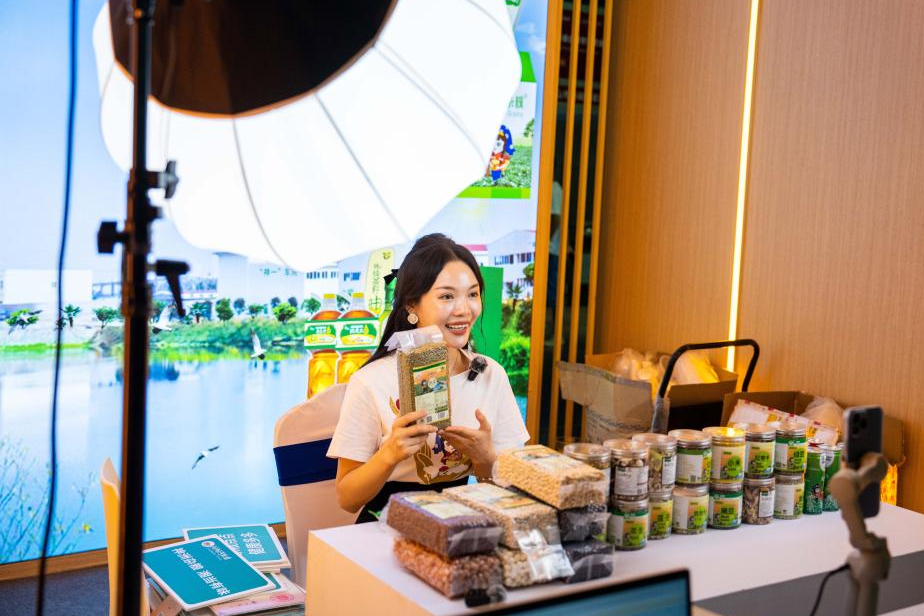 9月15日,在長沙國際會(huì)展中心,參展商通過直播推銷雜糧。