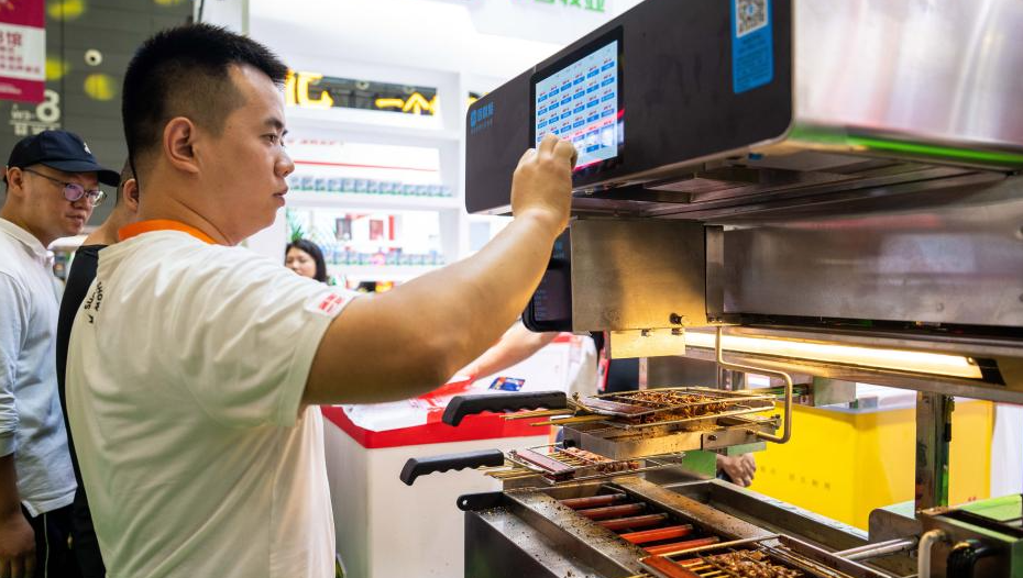 9月15日,在長沙國際會(huì)展中心,參展商在展示自動(dòng)燒烤機(jī)操作方法。
