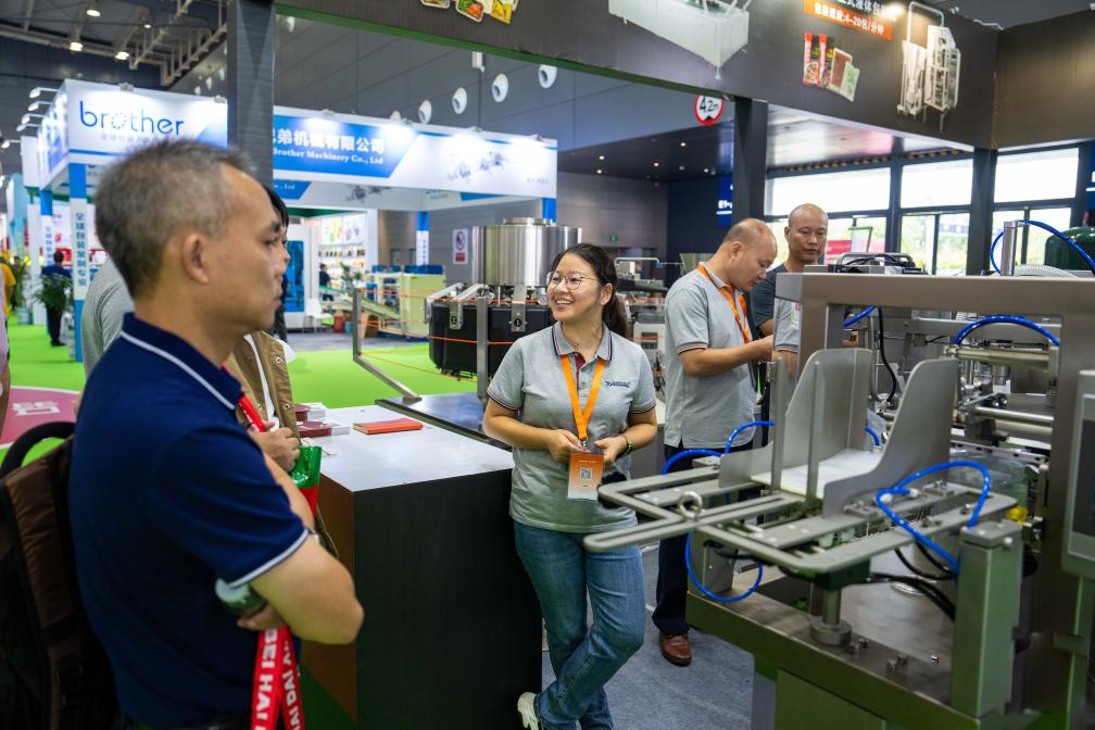 9月15日,在長沙國際會(huì)展中心,參展商(中)向觀眾介紹食品包裝設(shè)備。