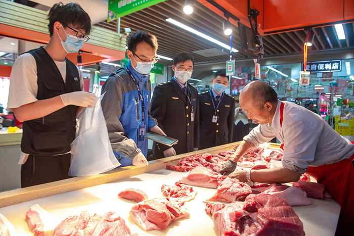 愛府路農(nóng)貿(mào)市場(chǎng)現(xiàn)場(chǎng)抽取豬肉封裝。明光市市場(chǎng)監(jiān)督管理局供圖