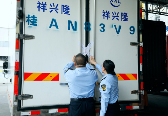 市場監(jiān)管部門駐點監(jiān)管人員對準(zhǔn)備發(fā)往學(xué)青會運動員村的食品專用運輸車輛張貼封條。何正君攝