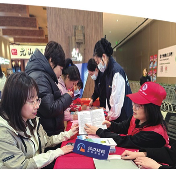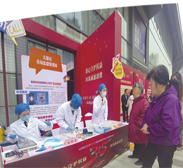 在安徽省合肥市活動(dòng)現(xiàn)場(chǎng),省市兩級(jí)市場(chǎng)監(jiān)管部門(mén)工作人員向消費(fèi)者宣講食品安全知識(shí),推介“你點(diǎn)我檢”活動(dòng),提供“你送我檢”快速檢測(cè)服務(wù)。