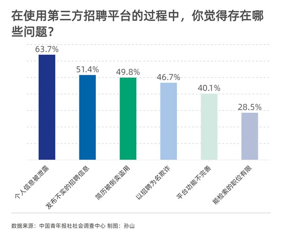 調(diào)查顯示,63.7%的受訪(fǎng)者覺(jué)得第三方招聘平臺(tái)存在信息泄露問(wèn)題,51.4%的受訪(fǎng)者覺(jué)得存在發(fā)布不實(shí)招聘信息的問(wèn)題。其他問(wèn)題還有:簡(jiǎn)歷被倒賣(mài)盜用(49.8%)、以招聘為名欺詐(46.7%)、平臺(tái)功能不完善(40.1%)和能檢索的職位有限(28.5%)等。