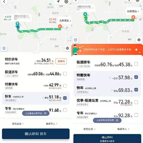 ——記者在某網(wǎng)約車平臺(tái)上搜索發(fā)現(xiàn),在同一時(shí)間于同一地點(diǎn)出發(fā)至北京西站,經(jīng)常使用該網(wǎng)約車平臺(tái)的用戶手機(jī)內(nèi)顯示的快車打車費(fèi)用預(yù)估為69.03元。但不經(jīng)常使用該平臺(tái)的用戶手機(jī)上顯示,打車費(fèi)用預(yù)計(jì)為51.18元,其中包含了17.05元被抵扣的優(yōu)惠券。但記者發(fā)現(xiàn),即便不選擇使用優(yōu)惠券抵扣車費(fèi),不經(jīng)常使用該平臺(tái)的用戶打車費(fèi)用是68.23元,比常用用戶顯示的車費(fèi)還便宜0.8元。