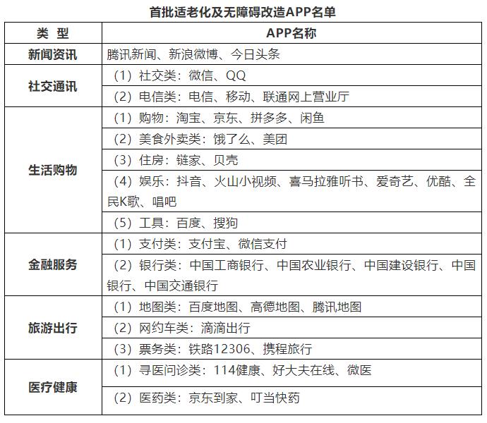 《方案》要求,開展老年人、殘疾人常用移動(dòng)互聯(lián)網(wǎng)應(yīng)用(APP)的適老化及無(wú)障礙改造。立足老年人、殘疾人的實(shí)際生活體驗(yàn),豐富滿足其需求的移動(dòng)互聯(lián)網(wǎng)應(yīng)用種類和功能,對(duì)《工業(yè)和信息化部中國(guó)殘疾人聯(lián)合會(huì)關(guān)于推進(jìn)信息無(wú)障礙的指導(dǎo)意見(jiàn)》中列出的移動(dòng)互聯(lián)網(wǎng)應(yīng)用十大領(lǐng)域、注冊(cè)用戶數(shù)超過(guò)5000萬(wàn)人、同類產(chǎn)品中市場(chǎng)份額排名前5名的APP進(jìn)行適老化及無(wú)障礙改造。首批優(yōu)先推動(dòng)新聞資訊、社交通訊、生活購(gòu)物、金融服務(wù)、旅游出行、醫(yī)療健康等6大類、共43個(gè)APP進(jìn)行適老化及無(wú)障礙改造。中國(guó)信息通信研究院協(xié)助各互聯(lián)網(wǎng)企業(yè),在開發(fā)設(shè)計(jì)移動(dòng)互聯(lián)網(wǎng)應(yīng)用(APP)的過(guò)程中落實(shí)信息無(wú)障礙有關(guān)標(biāo)準(zhǔn)的要求,并將無(wú)障礙優(yōu)化納入產(chǎn)品及服務(wù)的日常維護(hù)流程。