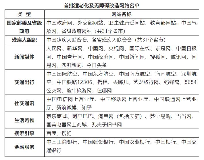 《方案》提出,開展互聯(lián)網(wǎng)主要行業(yè)網(wǎng)站適老化及無(wú)障礙改造。緊密結(jié)合老年人、殘疾人等群體的實(shí)際需求,對(duì)《工業(yè)和信息化部中國(guó)殘疾人聯(lián)合會(huì)關(guān)于推進(jìn)信息無(wú)障礙的指導(dǎo)意見(jiàn)》(工信部聯(lián)信管〔2020〕146號(hào))中提出的與老年人、殘疾人等群體工作、生活密切相關(guān)的公共服務(wù)類網(wǎng)站開展適老化及無(wú)障礙改造。首批優(yōu)先推動(dòng)國(guó)家相關(guān)部委及省級(jí)人民政府、殘疾人組織、新聞媒體、交通出行、金融服務(wù)、社交通訊、生活購(gòu)物、搜索引擎等8大類、共115家網(wǎng)站進(jìn)行改造。中國(guó)互聯(lián)網(wǎng)協(xié)會(huì)協(xié)助基礎(chǔ)電信企業(yè)及網(wǎng)站接入服務(wù)商加快互聯(lián)網(wǎng)無(wú)障礙服務(wù)體系建設(shè),持續(xù)推動(dòng)互聯(lián)網(wǎng)信息無(wú)障礙環(huán)境建設(shè)健康發(fā)展。