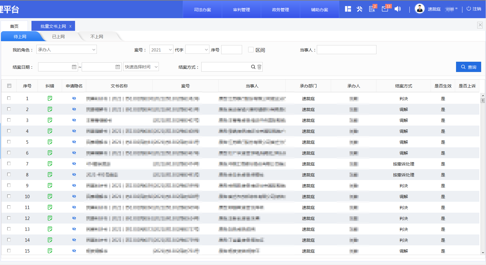 開發(fā)速裁快審系統(tǒng),支持批量案件流程事項(xiàng)的批量辦理,如批量審判組織設(shè)置、排期、扣除審限、報(bào)結(jié)案、移送上訴等,大大簡化了操作,提高工作效率,系統(tǒng)模塊化嵌入法綜系統(tǒng),用戶體驗(yàn)好,操作簡便實(shí)用。為實(shí)現(xiàn)法官對簡案的快速辦理,將法官常用個(gè)案辦理功能放入“快捷辦理”列表中,并集成智能閱卷、文書制作、司法送達(dá)等智能卷宗功能,無須進(jìn)入個(gè)案辦理頁面即可直接進(jìn)行相關(guān)流程的辦理,簡化操作。