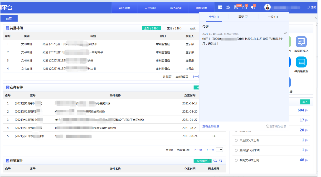 自系統(tǒng)上線以來,宿遷市兩級法院已在院機(jī)關(guān)、派出法庭等具有立案功能的場所進(jìn)行了部署。安排專職人員負(fù)責(zé)引導(dǎo),調(diào)整立案流程,立案大廳排隊(duì)情況得到了較好的緩解,當(dāng)事人的急躁情緒也更加緩和。通過立案產(chǎn)生要素表以后,全面應(yīng)用到審判各環(huán)節(jié),有效提高了法官的審理效率,減輕了制作文書的工作量。同時(shí),節(jié)點(diǎn)管控系統(tǒng)的應(yīng)用助力院庭長抓好速裁案件管理,有力提升質(zhì)效。今年1-10月,在江蘇高院公布的12項(xiàng)質(zhì)效指標(biāo)中,宿遷法院9項(xiàng)指標(biāo)排名全省前三,其中5項(xiàng)指標(biāo)排名第一,各類指標(biāo)持續(xù)向好。