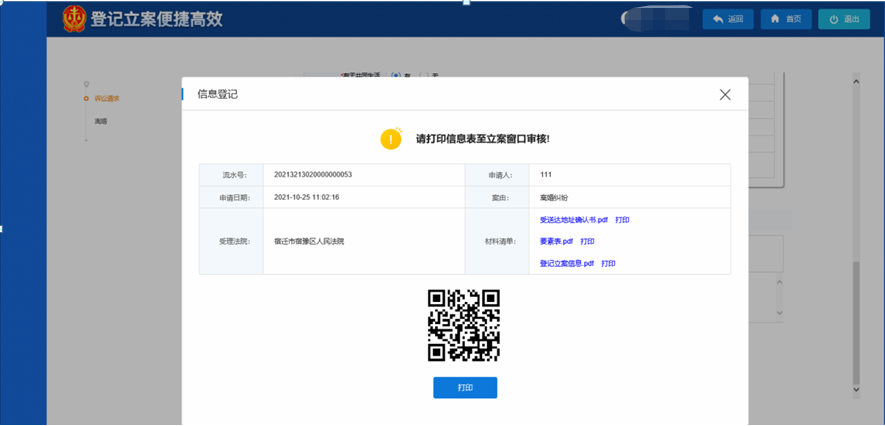 登記完成后生成二維碼,移送立案。自助登記操作平均只需幾分鐘即可完成。立案窗口通過掃描二維碼自動關(guān)聯(lián)登記信息,自動回填數(shù)據(jù)到立案系統(tǒng),審核完畢后立案。通過立案信息登記前置和當(dāng)事人自助登記填單有效提升了立案信息的準(zhǔn)確率和可用性,同時(shí),將立案流程一分為二,大大縮短了立案時(shí)間,讓當(dāng)事人從被動的等待變?yōu)橹鲃拥膮⑴c,有效緩解當(dāng)事人因長時(shí)間排隊(duì)等待立案產(chǎn)生的焦躁情緒。