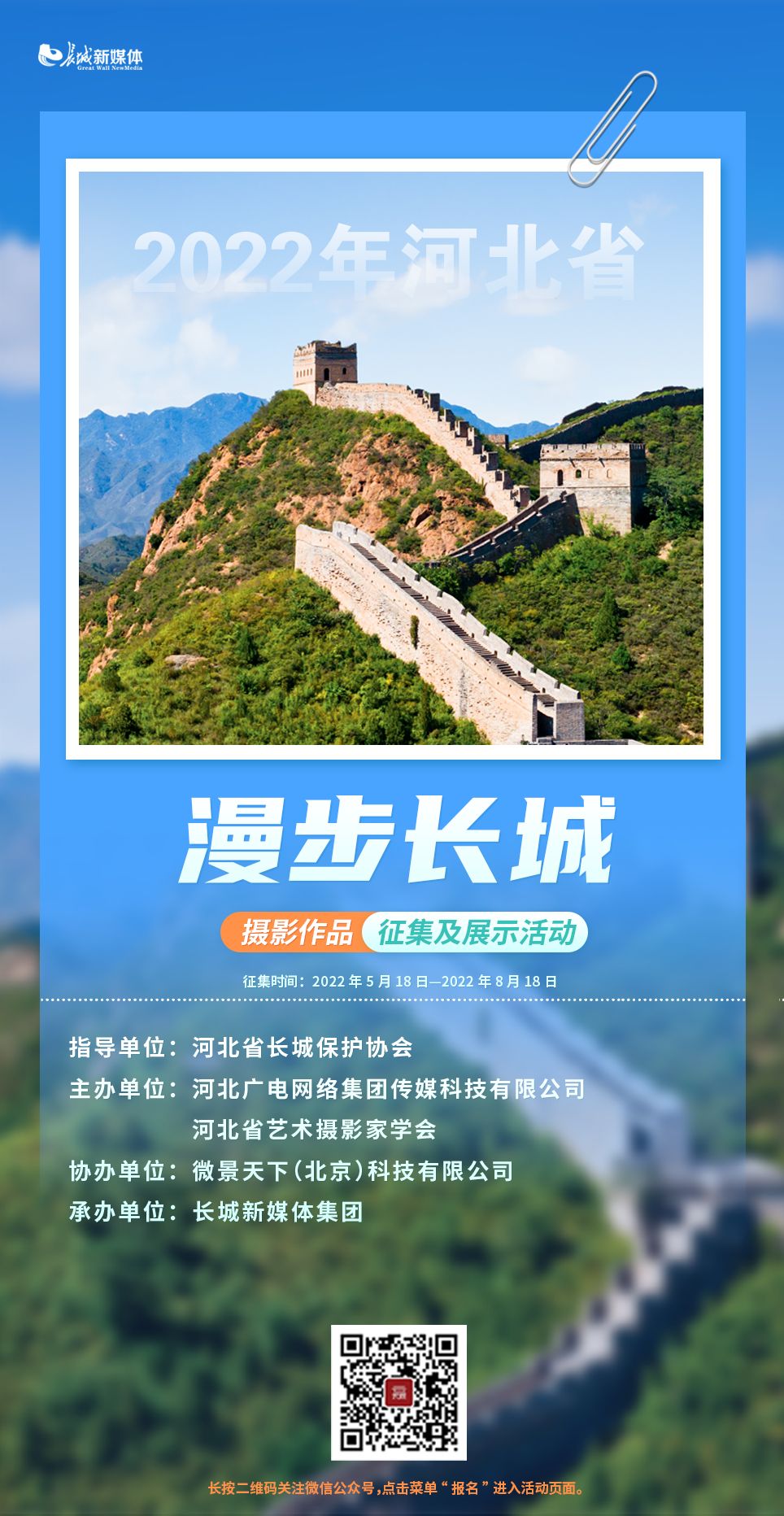長(zhǎng)城網(wǎng)·冀云客戶端5月18日訊(記者 陳兆月)5月18日,2022年河北省“漫步長(zhǎng)城”主題攝影作品征集及展示活動(dòng)正式啟動(dòng)。