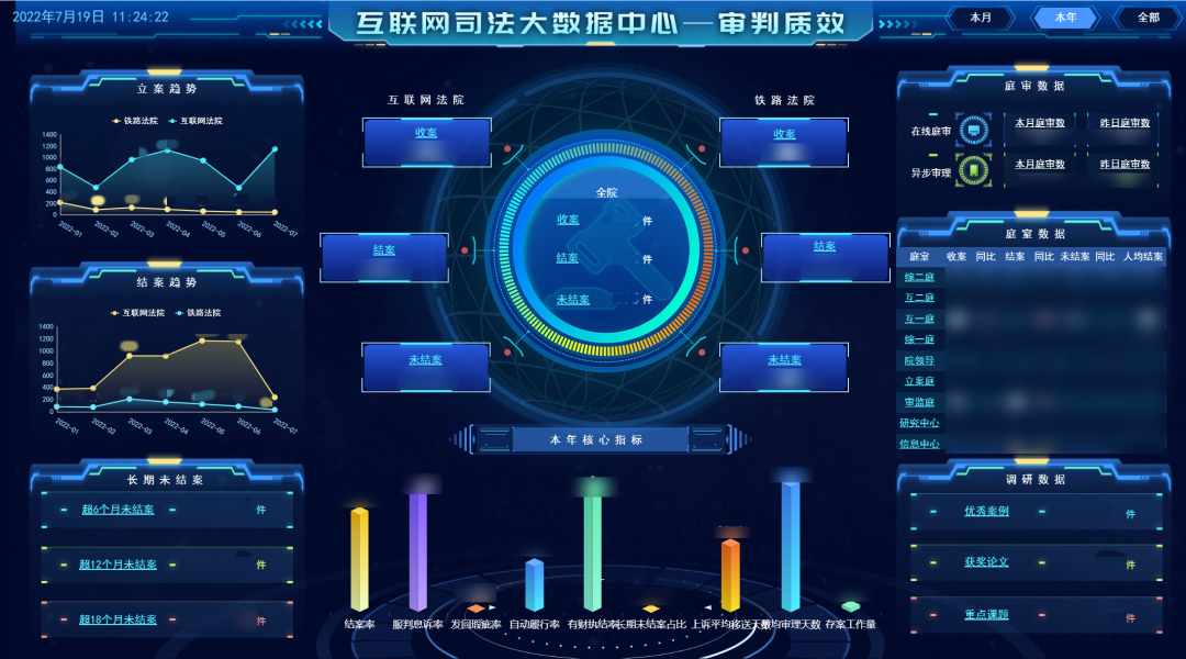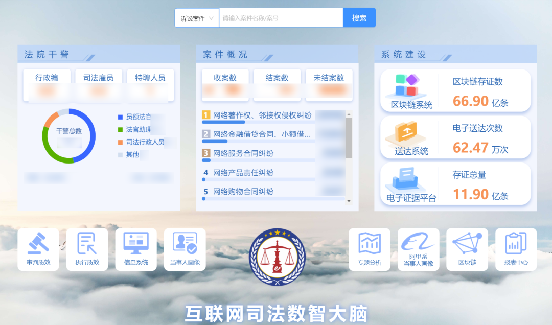 互聯(lián)網(wǎng)司法數(shù)智大腦構(gòu)建了法院的數(shù)字畫像,實(shí)現(xiàn)實(shí)體法院與虛擬法院之間的虛實(shí)映射、實(shí)時交互和全生命周期管理。系統(tǒng)通過審判質(zhì)效、執(zhí)行質(zhì)效、當(dāng)事人畫像等8個維度,運(yùn)用時間、地域、主體、案由、標(biāo)的、行業(yè)等動態(tài)模型對數(shù)據(jù)進(jìn)行綜合分析應(yīng)用,支持對案件、法官、當(dāng)事人等信息進(jìn)行最小顆粒度精準(zhǔn)搜索,一屏總覽全院動態(tài),一鍵直達(dá)數(shù)據(jù)底層。