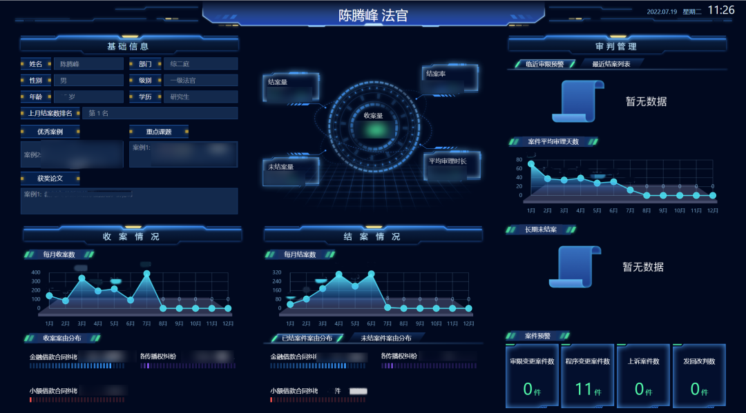 法官數(shù)字畫像對法官的數(shù)據(jù)進(jìn)行歸集和細(xì)化,從個人信息、調(diào)研和案例、收結(jié)案情況、辦案質(zhì)效、案件類型、審限預(yù)警、辦案習(xí)慣、案件預(yù)警等維度對法官進(jìn)行了完整畫像和能力分析?;诋嬒窈湍芰Φ姆治觯ㄟ^模型算法的構(gòu)建,在分案中進(jìn)行科學(xué)化精細(xì)化管理,對短板進(jìn)行精準(zhǔn)化補(bǔ)強(qiáng),同時自動打造出“千人千面”的法官工作臺,幫助法官解決在辦案過程中遇到的各個難點(diǎn)、堵點(diǎn)和痛點(diǎn)。