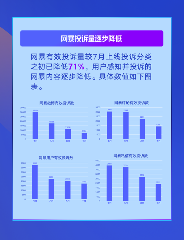 今年7月以來(lái),微博網(wǎng)暴投訴分類(lèi)下的用戶(hù)投訴量逐月降低。截至10月底,網(wǎng)暴有效投訴量相較7月已降低71%,用戶(hù)感知并投訴的網(wǎng)暴內(nèi)容逐步降低。