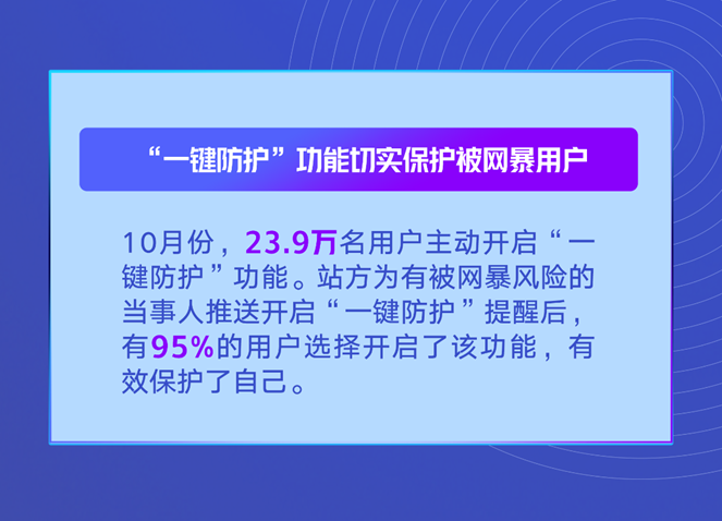 10月份,微博有23.9萬(wàn)名用戶(hù)主動(dòng)開(kāi)啟“一鍵防護(hù)”功能。微博為有被網(wǎng)暴風(fēng)險(xiǎn)的當(dāng)事人推送開(kāi)啟“一鍵防護(hù)”提醒后,有95%的用戶(hù)選擇開(kāi)啟了該功能,有效保護(hù)了自己。