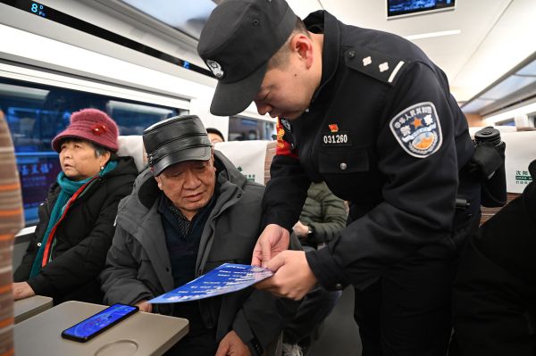 1月5日,遼寧省沈陽鐵路公安處乘警支隊民警在列車上向旅客講解反詐知識。