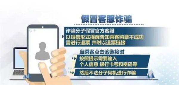 假冒客服詐騙:詐騙分子假冒官方客服以短信形式提醒告知乘客購(gòu)票不成功,需進(jìn)行退票,并附以退票鏈接。當(dāng)乘客點(diǎn)擊該鏈接時(shí),按照提示需要輸入個(gè)人信息、銀行卡號(hào)和密碼等,然后不法分子伺機(jī)進(jìn)行詐騙。