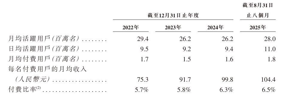 月均付費(fèi)用戶數(shù)量雖有所波動(dòng),但是付費(fèi)比率和每名付費(fèi)用戶的月均收入持續(xù)上漲。付費(fèi)比率從2022年的5.7%上漲到2025年前8個(gè)月的6.5%;每名付費(fèi)用戶的月均收入從2022年的75.3元,增長到了2025年前8個(gè)月的104.4元。