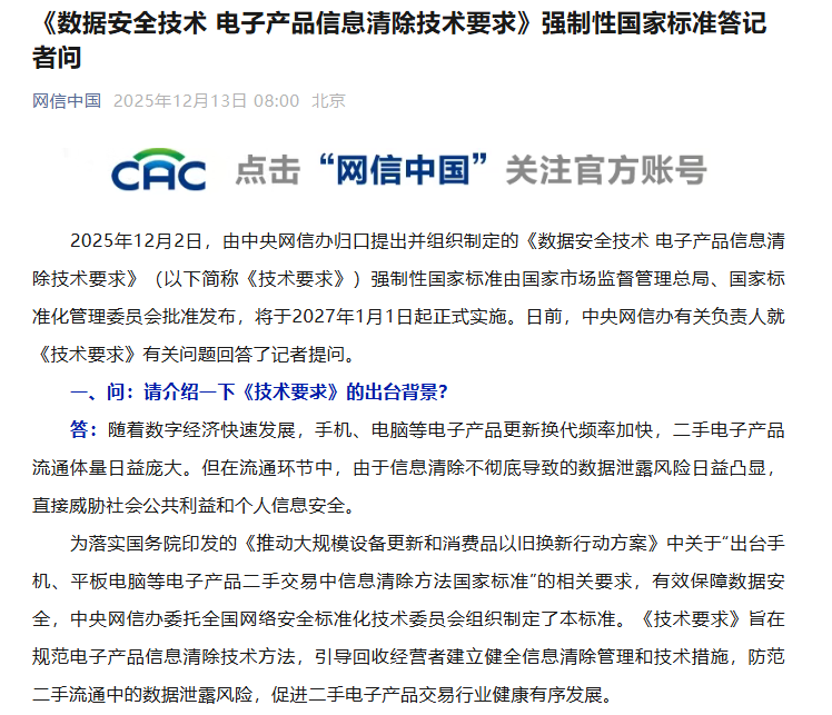 2025年12月2日,由中央網(wǎng)信辦歸口提出并組織制定的《數(shù)據(jù)安全技術 電子產(chǎn)品信息清除技術要求》(以下簡稱《技術要求》)強制性國家標準由國家市場監(jiān)督管理總局、國家標準化管理委員會批準發(fā)布,將于2027年1月1日起正式實施。日前,中央網(wǎng)信辦有關負責人就《技術要求》有關問題回答了記者提問。