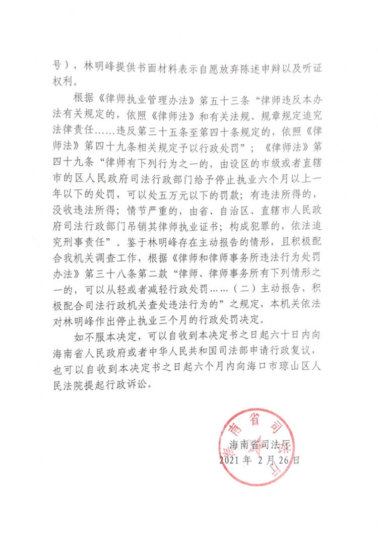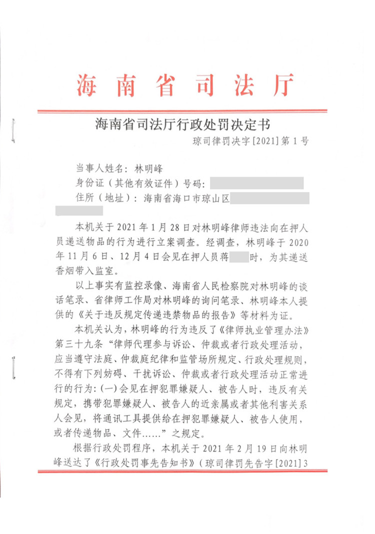 海南律師林明峰因違規(guī)會見被處停止執(zhí)業(yè)三個月