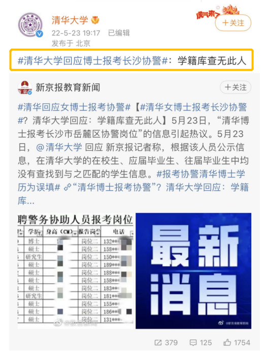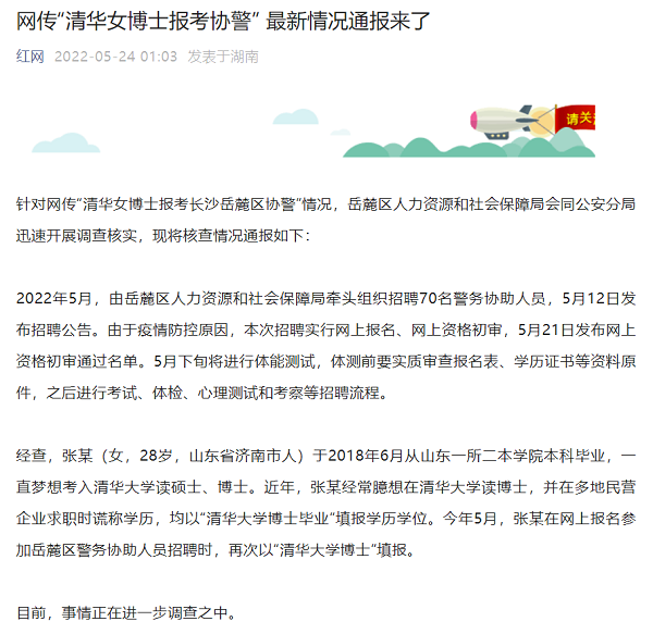 5月23日,有關(guān)“清華博士報考長沙市岳麓區(qū)協(xié)警崗位”的網(wǎng)上消息引發(fā)關(guān)注,并沖上微博熱搜。有媒體報道稱,近日網(wǎng)友爆料,有清華博士生報考長沙市岳麓區(qū)協(xié)警崗位。據(jù)岳麓區(qū)人民政府官網(wǎng)5月21日公布的《岳麓區(qū)2022年招聘警務協(xié)助人員報考審核通過名單公告》顯示,在通過“警務協(xié)助人員崗位二”審核的人員表格中,出現(xiàn)了眾多高學歷人員,其中最高學歷為一位1994年出生的張姓女博士(特長備注為“清華大學”)。