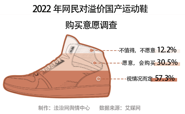 從艾媒網(wǎng)公布的數(shù)據(jù)來看,30.5%的消費(fèi)者表示,無論國產(chǎn)運(yùn)動鞋溢價多少都愿意購買,57.3%的消費(fèi)者稱會視溢價情況而定,12.2%的消費(fèi)者表示不會購買國產(chǎn)溢價運(yùn)動鞋。