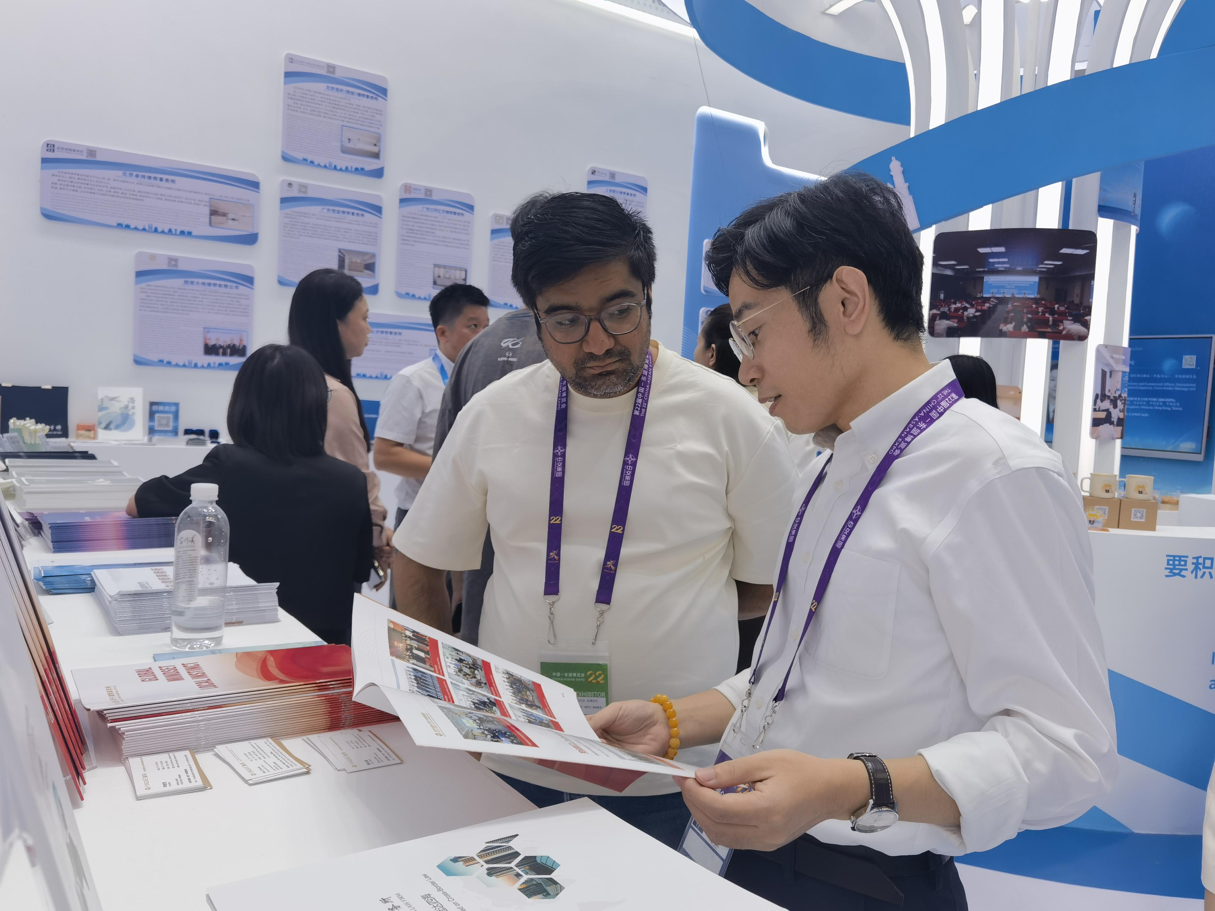 2025年9月17日,在2025年面向東盟涉外法律服務展覽會上,志愿律師向外商展示法律服務產品。