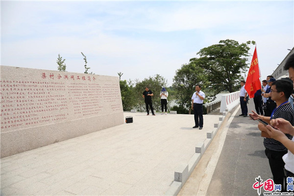 2019年6月12日,濮陽(yáng)縣渠村。渠村分洪閘除險(xiǎn)加固工程于2017年3月25日正式開(kāi)工,包括閘室段混凝土缺陷處理,機(jī)架橋、公路橋拆除重建等項(xiàng)目。2018年6月20日成功實(shí)施閘門(mén)聯(lián)合啟閉試驗(yàn),基本具備分滯洪條件。工程于2018年12月正式完工。圖為渠村引黃入冀補(bǔ)淀渠首閘負(fù)責(zé)人在渠村分洪閘工程簡(jiǎn)介石碑前為采訪團(tuán)記者講解。記者趙超 攝