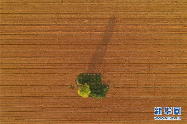 6月13日無人機拍攝的雄安新區(qū)大王鎮(zhèn)小王村成熟的麥田。 近日,雄安新區(qū)小麥陸續(xù)成熟,當(dāng)?shù)卮迕駬屪マr(nóng)時進行收獲。 新華社記者 朱旭東 攝