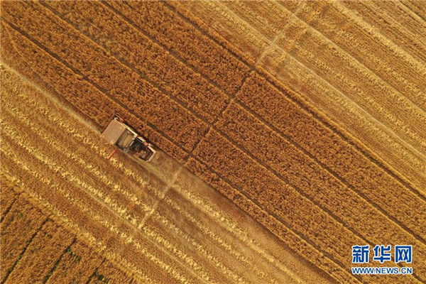 6月13日,雄安新區(qū)大王鎮(zhèn)小王村村民在收獲小麥(無人機(jī)拍攝)。 近日,雄安新區(qū)小麥陸續(xù)成熟,當(dāng)?shù)卮迕駬屪マr(nóng)時進(jìn)行收獲。 新華社記者 邢廣利 攝