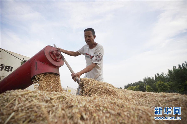 6月13日,雄安新區(qū)大王鎮(zhèn)小王村村民李有忠在收獲小麥。 近日,雄安新區(qū)小麥陸續(xù)成熟,當(dāng)?shù)卮迕駬屪マr(nóng)時(shí)進(jìn)行收獲。 新華社記者 邢廣利 攝