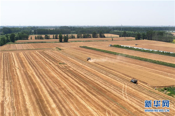 雄安新區(qū)安新縣農(nóng)民在收割小麥(6月14日攝)。 新華社記者 張笑宇 攝