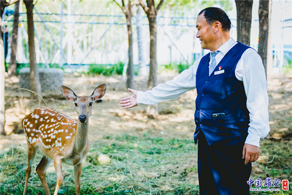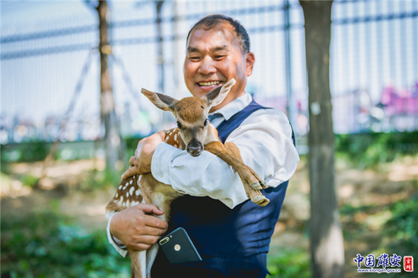 6月23日下午1點(diǎn)48分,雄安新區(qū)的梅花鹿“雄雄、安安”順利生下鹿寶寶。圖為雄安市民服務(wù)中心園區(qū)環(huán)境管理部主任李國(guó)元抱著鹿寶寶。中國(guó)雄安官網(wǎng)記者馬夢(mèng)迪 攝