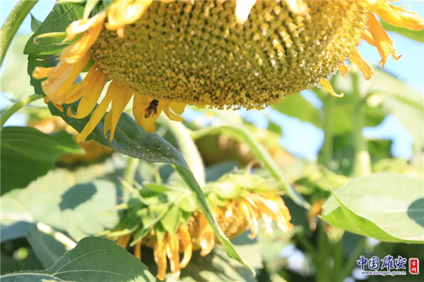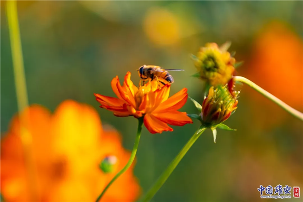 落在硫華菊上的蜜蜂正“辛勤工作”。中國(guó)雄安官網(wǎng)記者毛鶴然 攝