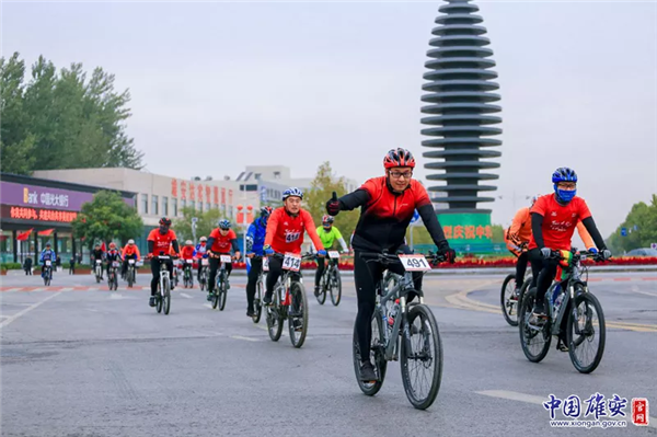 2019全民健身·雄安新區(qū)環(huán)白洋淀國際自行車賽現(xiàn)場(chǎng),參賽選手面對(duì)鏡頭豎起大拇指。
