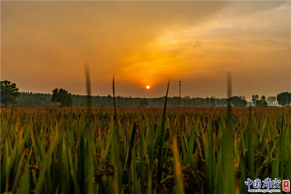 白洋淀碼頭附近,夕陽映著稻田,一派和諧靜謐的景象。中國雄安官網(wǎng)毛鶴然 攝