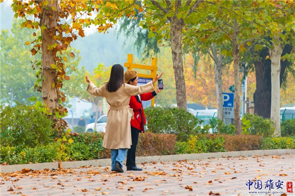 人們拿出手機(jī)與雄安秋色合影。中國雄安官網(wǎng)王京卓 攝