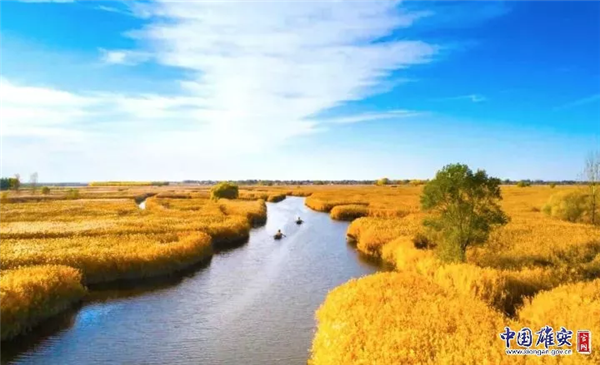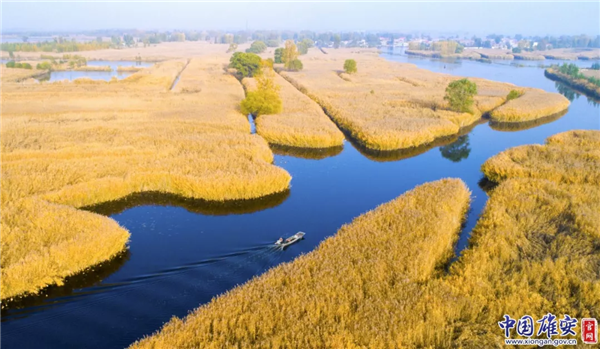 深秋時(shí)節(jié)的白洋淀旁,大片水稻成熟,滿目金黃。中國雄安官網(wǎng)毛鶴然 攝