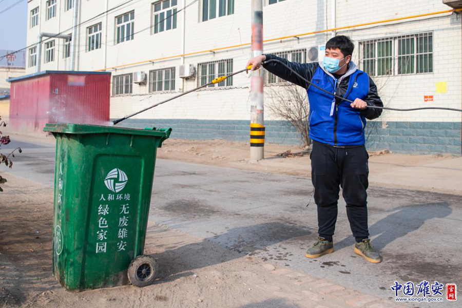 三臺(tái)鎮(zhèn)崔公堤村黨支部工作人員對(duì)垃圾桶進(jìn)行噴灑消毒。中國(guó)雄安官網(wǎng)記者牛思佳 攝