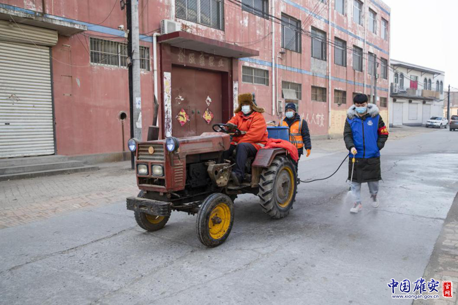 崔公堤村黨支部工作人員對(duì)街道進(jìn)行噴灑消毒。中國(guó)雄安官網(wǎng)記者牛思佳 攝