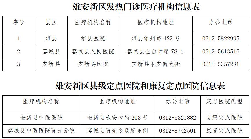 雄安新區(qū)發(fā)熱門(mén)診、定點(diǎn)醫(yī)院、康復(fù)醫(yī)院信息公示