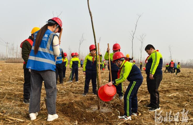 2021年3月11日,“千年秀林”管護(hù)人員與容城縣賈光鄉(xiāng)東張楚小學(xué)的學(xué)生們一起種下“雄安樹”。