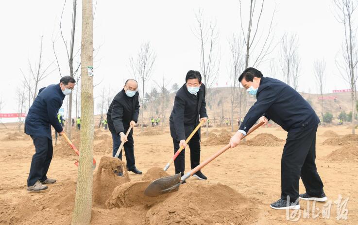 初春時節(jié),寒意侵人,天空中不時下著細(xì)雨。王東峰、許勤、葉冬松等與雄安新區(qū)近400名干部群眾共同揮鍬鏟土、提桶澆水,栽下油松、白蠟、銀杏等樹木。石家莊市滹沱河北岸植樹造林工作同步推進(jìn),350多名來自石家莊各界的黨員干部群眾緊張忙碌、栽植新苗,現(xiàn)場一片熱火朝天景象。