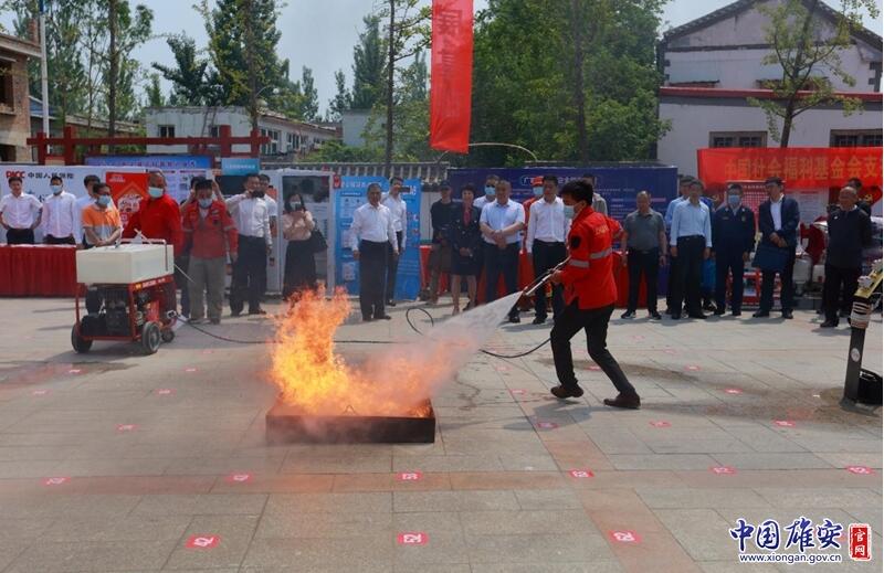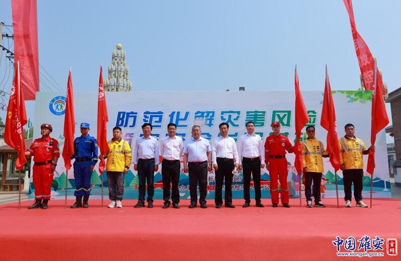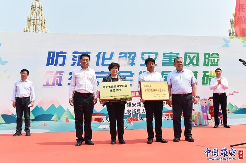 在全國防災(zāi)減災(zāi)日宣傳活動(dòng)現(xiàn)場,戴泊生向安新小學(xué)頒發(fā)省級地震科普教育示范學(xué)校牌匾,劉樹軍向東淀頭村頒發(fā)全國綜合減災(zāi)示范社區(qū)牌匾,兩位領(lǐng)導(dǎo)共同向雄州救援隊(duì)、雄風(fēng)救援隊(duì)、藍(lán)天救援隊(duì)、美團(tuán)代表隊(duì)等新區(qū)安全宣傳志愿者隊(duì)伍代表授旗。中國人民財(cái)產(chǎn)保險(xiǎn)股份有限公司雄安分公司籌建負(fù)責(zé)人張友林為活動(dòng)致開幕詞,中國福利基金會(huì)支持雄安公益基金執(zhí)行主任、北京支持雄安產(chǎn)業(yè)發(fā)展促進(jìn)會(huì)常務(wù)副會(huì)長兼秘書長彌雪向雄安新區(qū)捐贈(zèng)了高空細(xì)水霧滅火消防車。