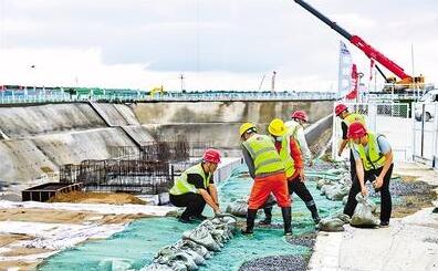 7月12日,施工人員在雄安新區(qū)啟動(dòng)區(qū)放置沙袋。河北日?qǐng)?bào)記者耿輝 攝