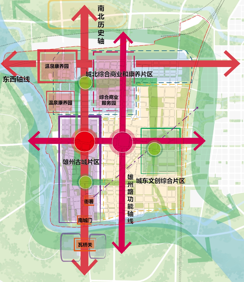 “池面綠陰通易水,樓頭青靄見狼山,漁舟掩映江南浦,使驛差池古北關(guān)”。雄縣組團縣城片區(qū)在白溝引河、大清河、新蓋房分洪道三條水脈的拱衛(wèi)下,仿若一朵秀美荷花,緩緩綻放。規(guī)劃方案遵循其良好的生態(tài)本底與景觀特色,同時溯源雄縣延續(xù)千年的古城形制和歷史街巷格局,整體形成“一水彎環(huán)、雙軸交匯、一城兩片”的空間布局結(jié)構(gòu)。大清河依城而過,南北歷史軸和新區(qū)東西軸交匯于縣城,雄州路和文昌大街交匯形成內(nèi)部功能發(fā)展軸,依托城、關(guān)、河等歷史要素,恢復雄州古城歷史格局,發(fā)展城東文創(chuàng)綜合片區(qū)、城北綜合商業(yè)和康養(yǎng)片區(qū)。